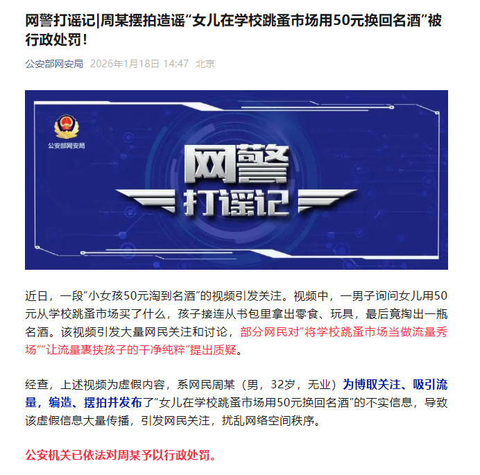 经查,上述视频为虚假内容,系网民周某(男,32岁,无业)为博取关注、吸引流量,编造、摆拍并发布了“女儿在学校跳蚤市场用50元换回名酒”的不实信息,导致该虚假信息大量传播,引发网民关注,扰乱网络空间秩序。