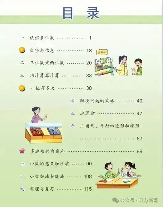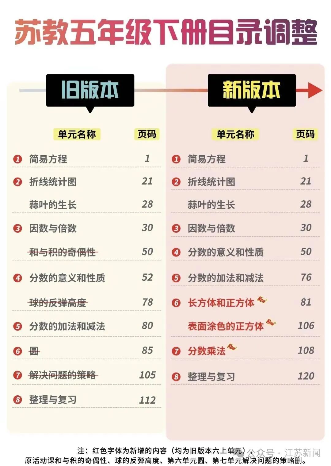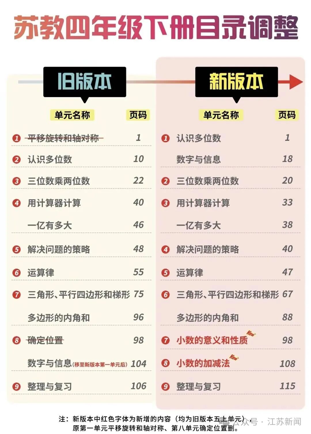 值得注意的是,2026年秋学期,四、五、六年级学生将使用数学新教材。为了确保教学平稳过渡,减少数学知识和技能上的断层与重复,2026年春学期,苏教版数学教材四、五年级将调整有关内容,将在江苏全省小学投入使用。
