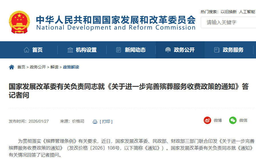 为贯彻落实《殡葬管理条例》有关要求,近日,国家发展改革委、民政部、财政部三部门联合印发《关于进一步完善殡葬服务收费政策的通知》(发改价格〔2026〕108号,以下简称《通知》)。国家发展改革委有关负责同志就《通知》有关情况回答了记者提问。
