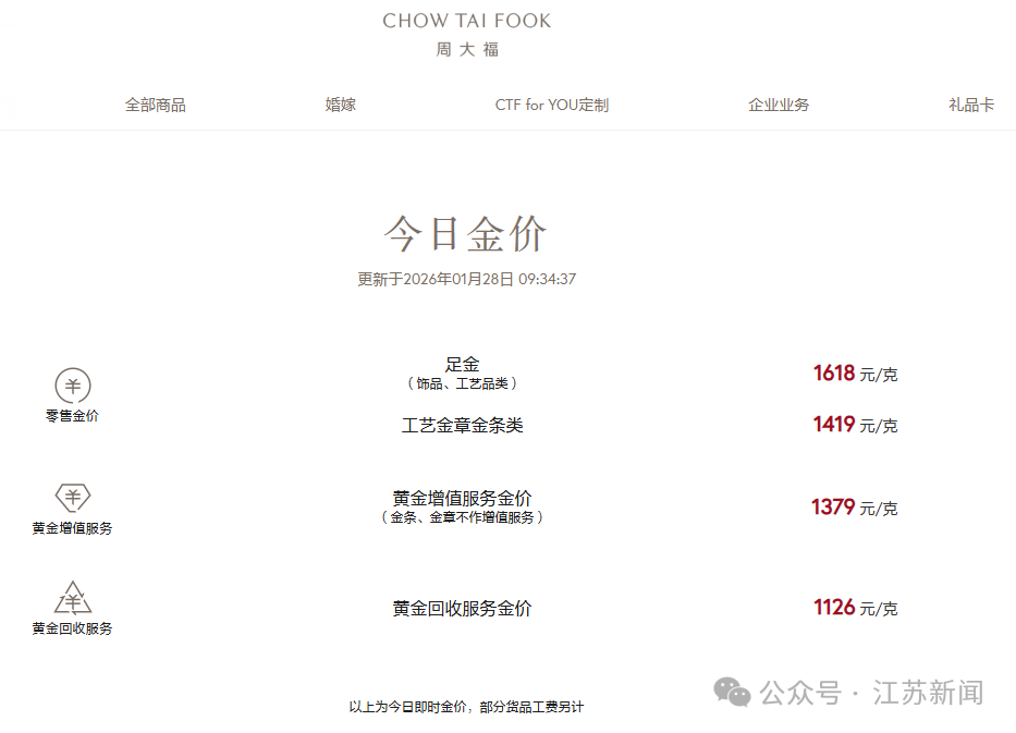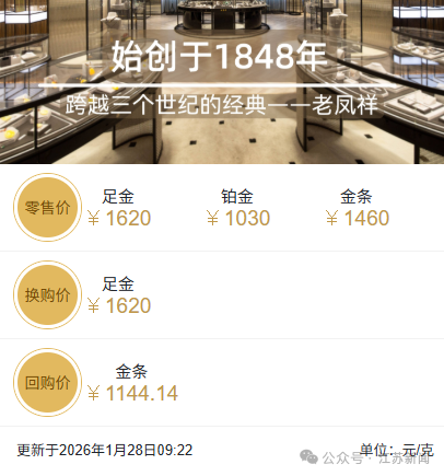 国内金饰克价也节节攀升。周大福报价1618元/克,老庙黄金报价1575元/克,周生生报价1614元/克,老凤祥为1620元/克。