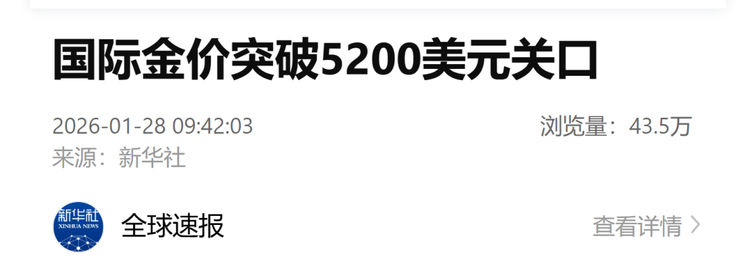 据新华社:美国东部时间27日,纽约商品交易所2月黄金期货价格在电子盘交易中突破每盎司5200美元的历史性关口。伦敦现货黄金价格稍早也一度突破了这一重要关口。