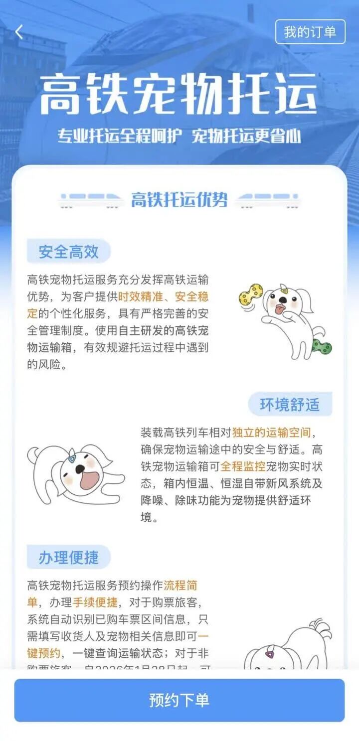 在预约方式上,服务针对购票旅客与非购票旅客实行差异化安排。已购买标有“宠”字标识车票的旅客,可直接在铁路12306客户端的“宠物托运”功能中查询仓位并完成线上预约,每日12时前最早可预约次日仓位,12时(含)后则最早可预约第三日仓位,且每位旅客最多可托运2只家庭驯养且健康状况良好的宠物。而非购票旅客,可线下办理高铁宠物托运。需在托运日前2至5天,通过“中铁快运”微信小程序,提供宠物相关信息、照片,进行预约下单,最多可托运1只宠物。