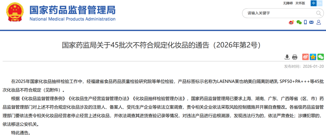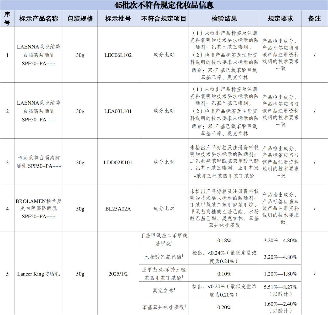 在2025年国家化妆品抽样检验工作中,经福建省食品药品质量检验研究院等单位检验,产品标签标示名称为LAENNA莱也纳美白隔离防晒乳SPF50+PA+++等45批次化妆品不符合规定(见附件)。