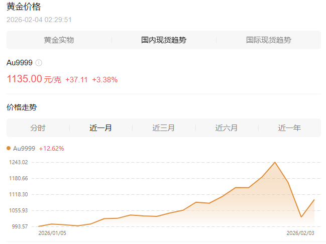 国内现货黄金报价1135元/克,涨3.38%。