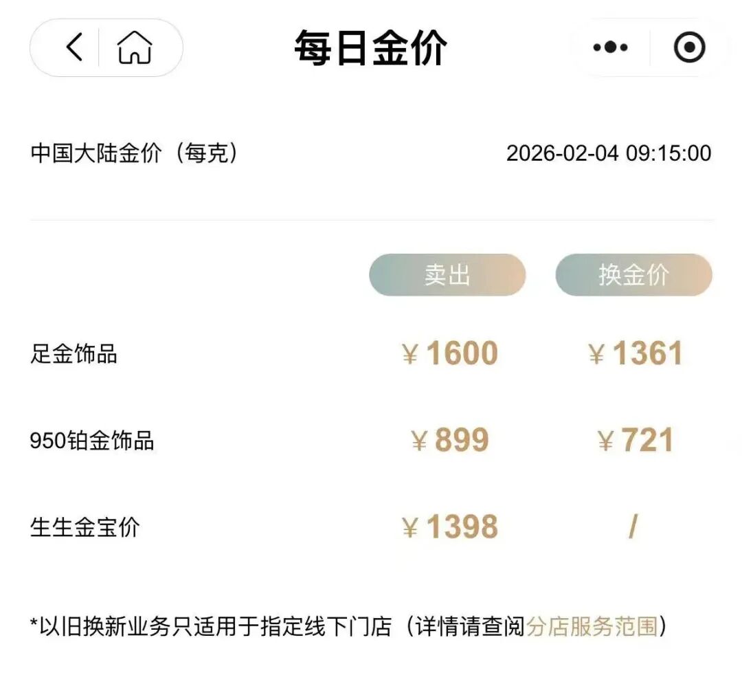 据查询,周生生足金饰品报1600元/克,较前一日1498元/克涨102元。