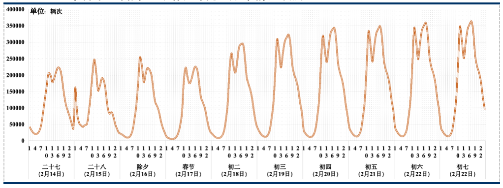 随着公众出行习惯发生深刻结构性变化,叠加春节假期免收小客车通行费时长增加、中长距离出行增加等因素,小客车流量较往年有所增加,预计约334万~350万辆次,其中,春节最后一天小客车流量更是有望达到427万辆次,达到历史最高峰。