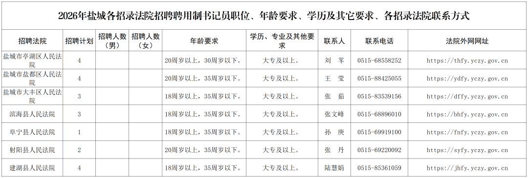 根据工作需要,江苏法院面向社会公开招聘聘用制书记员,其中,盐城7家法院招聘21人。