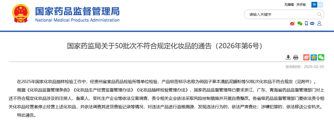 关于50批次不符合规定化妆品的通告
