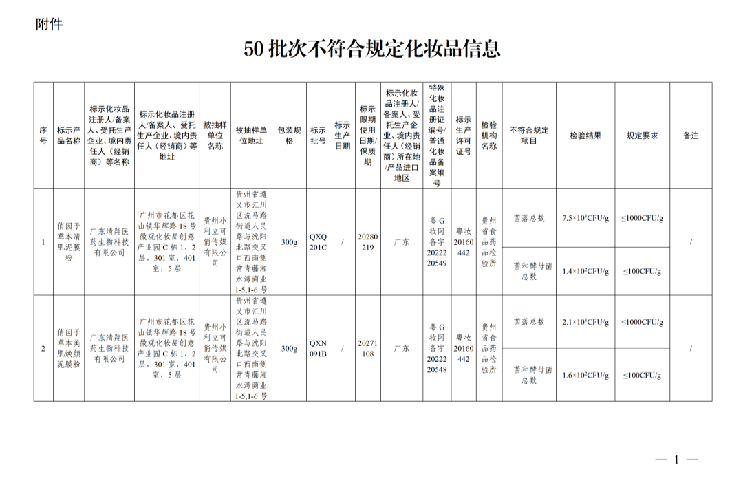 在2025年国家化妆品抽样检验工作中,经贵州省食品药品检验所等单位检验,产品标签标示名称为俏因子草本清肌泥膜粉等50批次化妆品不符合规定(见附件)。