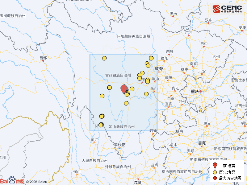 历史地震:根据中国地震台网速报目录,震中周边200公里内近5年来发生3级以上地震共124次,最大地震是2022年9月5日在四川甘孜州泸定县发生的6.8级地震(距离本次震中13公里),按震级大小前50次历史地震分布如图。