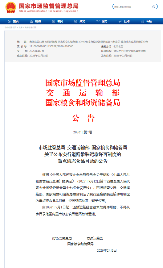 自2026年7月1日起,道路运输经营者未取得许可的,不得从事目录范围内重点液态食品道路散装运输。