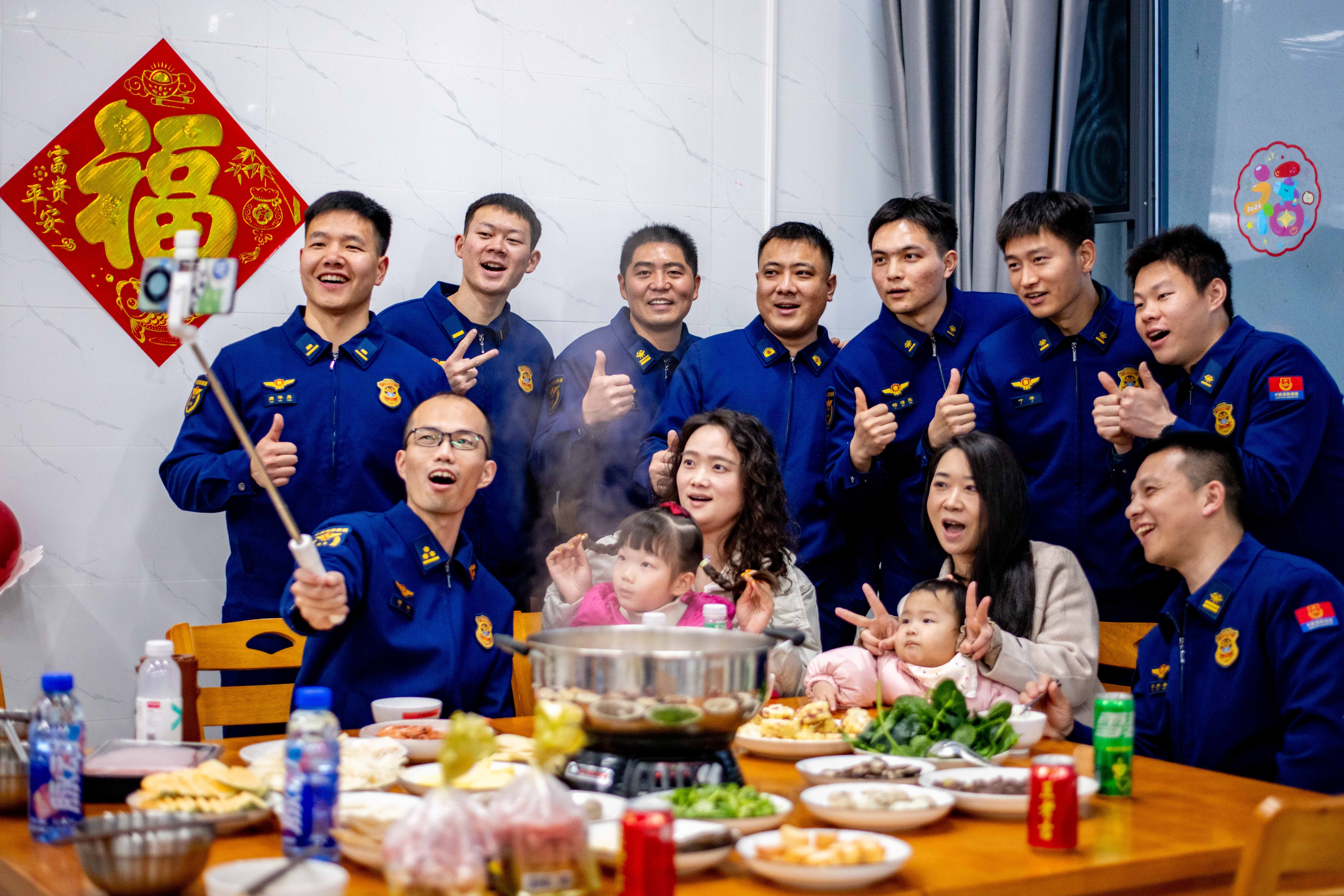 2月16日,在江苏省泰兴市澄江西路消防救援站,消防员们和家属在吃团圆饭前合影。杨玉岗 摄