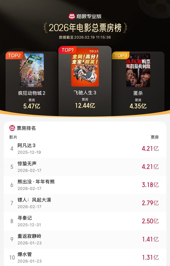 据猫眼专业版数据,截至2月19日11时14分,2026年年度总票房(含预售)突破50亿!《飞驰人生3》《疯狂动物城2》《匿杀》暂列年度票房榜前三位。