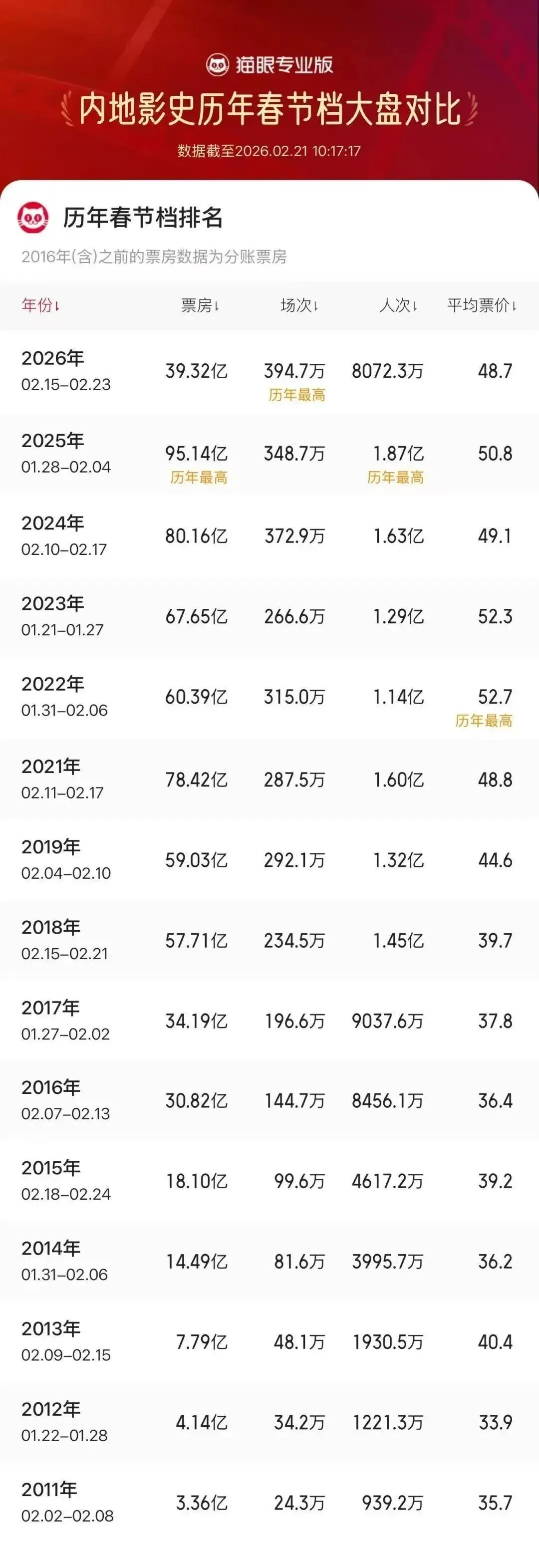 2月21日,猫眼专业版数据显示,2026年春节档总场次超394.7万,刷新中国影史春节档总场次纪录。