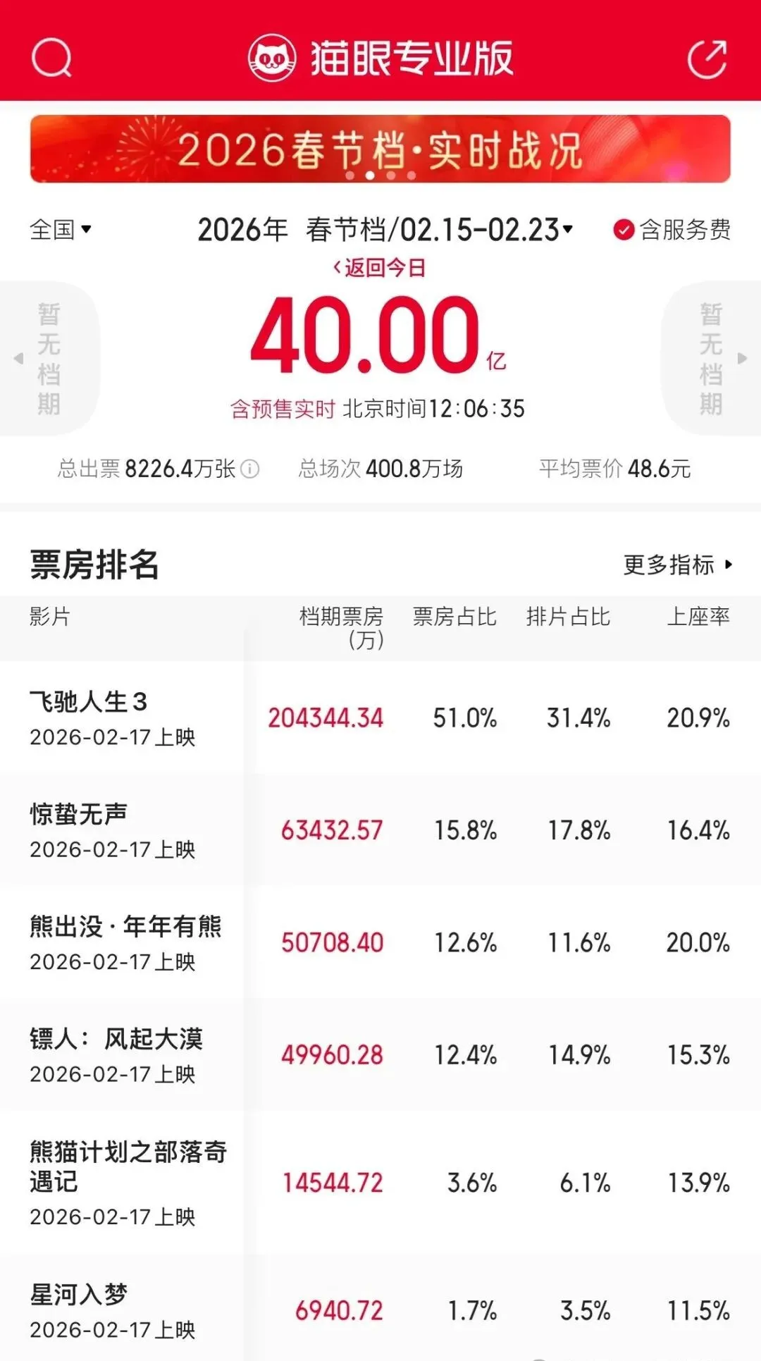 截至目前,春节档电影总票房(含预售)已突破40亿元,其中,《飞驰人生3》《惊蛰无声》《熊出没·年年有熊》位列前三。
