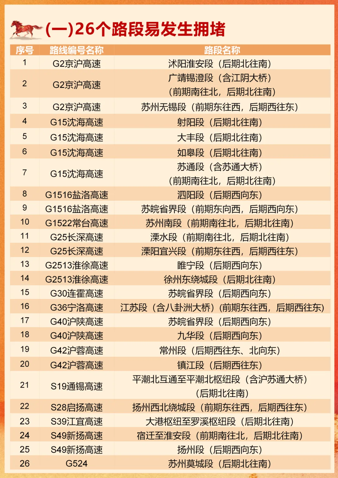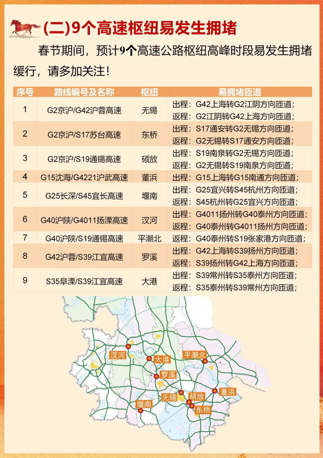 G1515盐靖高速溱潼、梁徐、姜堰、安丰、戴南、泰兴、兴化、张庄、大冈、盐城北、青墩双向,G1516盐洛高速泗阳东、泗阳双向,G25长深高速大浦、宋庄、伊山、连云港南、灌云南双向,G2513淮徐高速睢宁西、睢宁双向,G30连霍高速东海、东海西双向,平明往连云港方向,G40沪陕高速广陵双向,S21盐射高速合德、射阳双向,S28启扬高速扬州西往润扬大桥方向,S30如常高速魏村往常州方向,S35阜溧高速俞垛、兴化周庄双向,S49新扬高速双沟、管镇、陈集、刘集双向入口关闭。