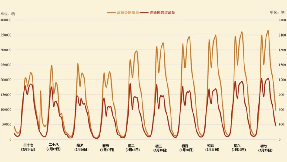 受春节“出程分散、返程集中”影响,腊月二十八至除夕流量较低,初四至初七流量较高,最高日预计为假期最后一日(2月23日),高速公路出口流量将达到419万~440万辆,普通国省道断面流量预计为15260~16000辆。