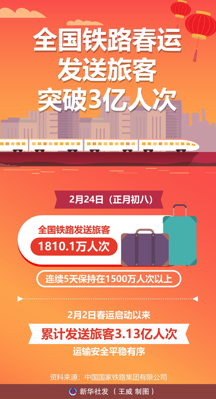 记者2月25日从中国国家铁路集团有限公司获悉,2月24日(正月初八),全国铁路发送旅客1810.1万人次,连续5天保持在1500万人次以上,2月2日春运启动以来累计发送旅客3.13亿人次,运输安全平稳有序。2月25日(正月初九),全国铁路预计发送旅客1665万人次,计划加开旅客列车1549列。