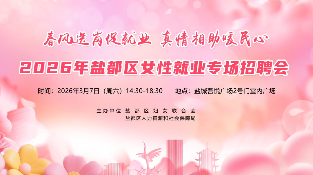 为庆祝“三八”国际妇女节,促进女性就业,搭建女性求职者与企业的沟通桥梁,2026年盐都区女性就业专场招聘会将于3月7日14:30—18:30在盐城吾悦广场2号门室内广场举行。想找工作的千万别错过啦!