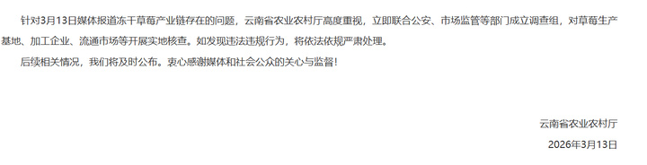 针对3月13日媒体报道冻干草莓产业链存在的问题,云南省农业农村厅高度重视,立即联合公安、市场监管等部门成立调查组,对草莓生产基地、加工企业、流通市场等开展实地核查。如发现违法违规行为,将依法依规严肃处理。后续相关情况,我们将及时公布。衷心感谢媒体和社会公众的关心与监督!