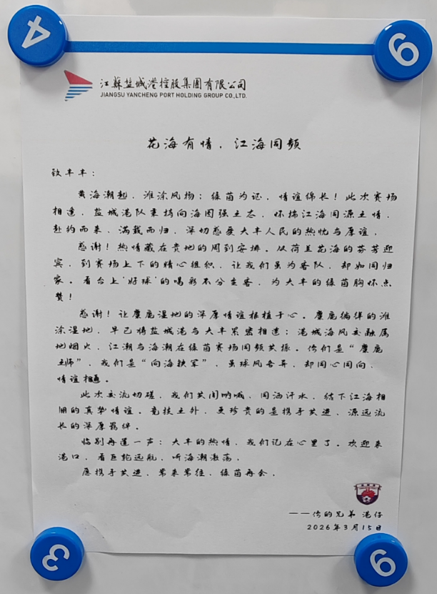盐城港队赛后写下感谢信