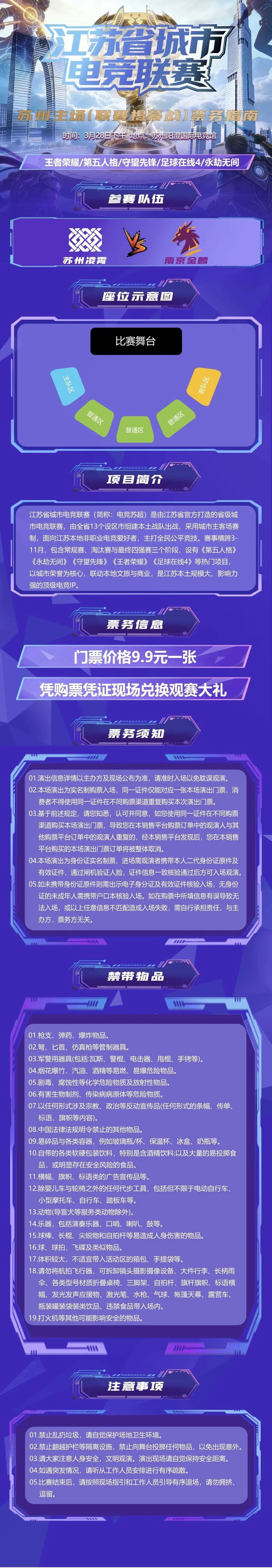 2026年江苏省城市电竞联赛(简称“电竞苏超”)揭幕战苏州VS南京,将于3月28日在苏州阳澄国际电竞馆正式启幕,3月17日14:00将正式开启售票,票价为9.9元。感兴趣的小伙伴,记得定好闹钟!