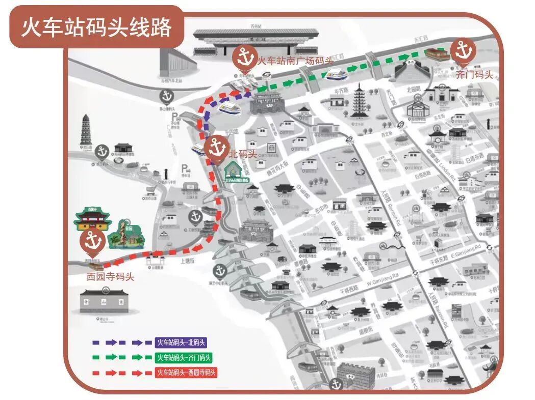 苏州火车站南广场码头(三条航线可选)出站即登船,水上游苏州。一路往齐门,抵拙政园、苏博、狮子林,开启人文探索之旅;一路往山塘街,可深入十里山塘,登临“最是红尘中一二等富贵风流之地”的阊门,品咖小憩;一路往西园,访古寺禅意,尝一碗素面,寻一刻清幽。