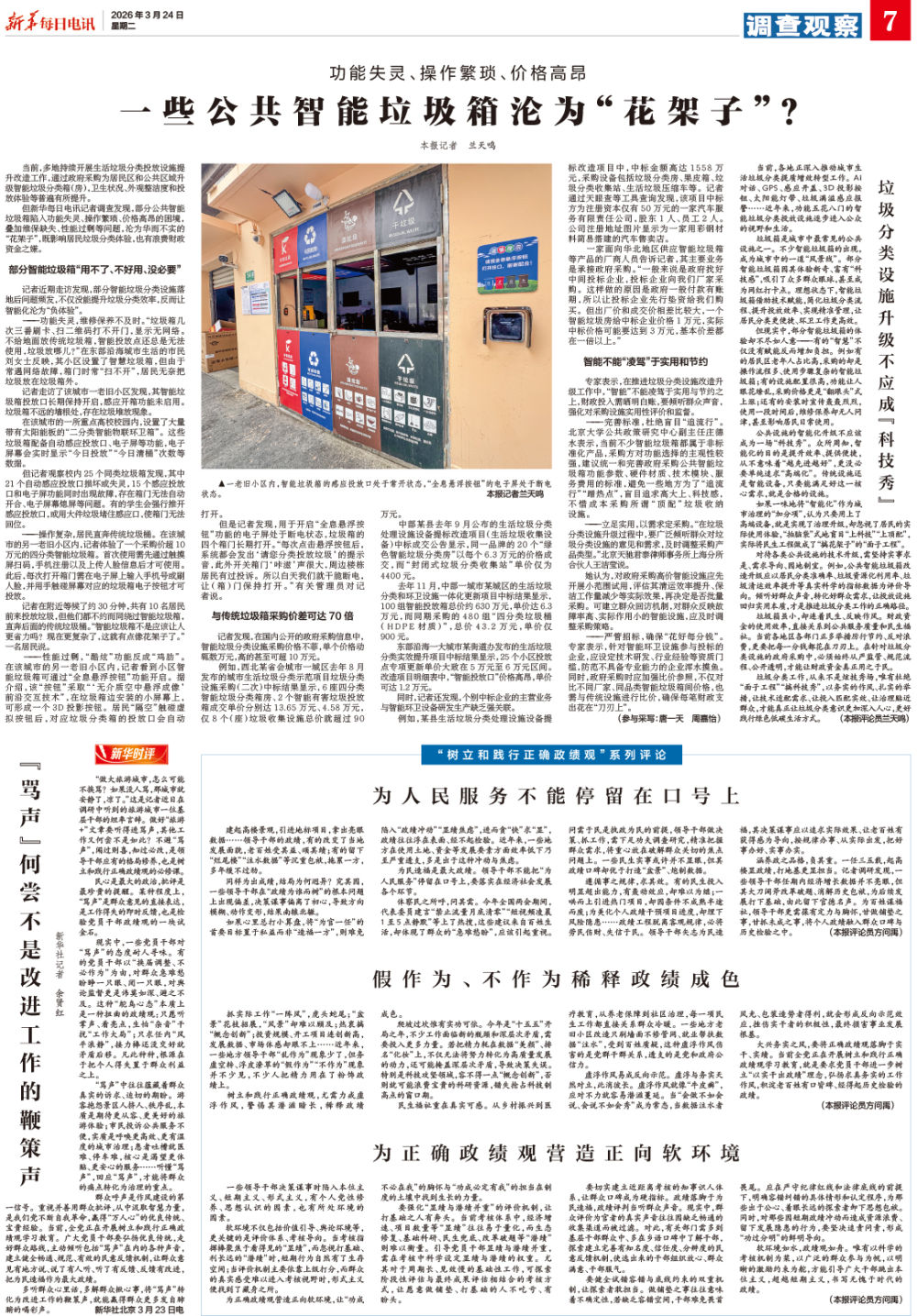 ——功能失灵,维修保养不及时。“垃圾箱几次三番刷卡、扫二维码打不开门,显示无网络。不给地面放传统垃圾箱,智能投放点还总是无法使用,垃圾放哪儿?”在东部沿海城市生活的市民刘女士反映,其小区设置了智慧垃圾箱,但由于常遇网络故障,箱门时常“扫不开”,居民无奈把垃圾放在垃圾箱外。