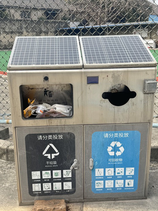 在该城市的一所重点高校校园内,设置了大量带有太阳能板的“二分类智能物联环卫箱”。这些垃圾箱配备自动感应投放口、电子屏等功能,电子屏幕会实时显示“今日投放”“今日清桶”次数等数据。