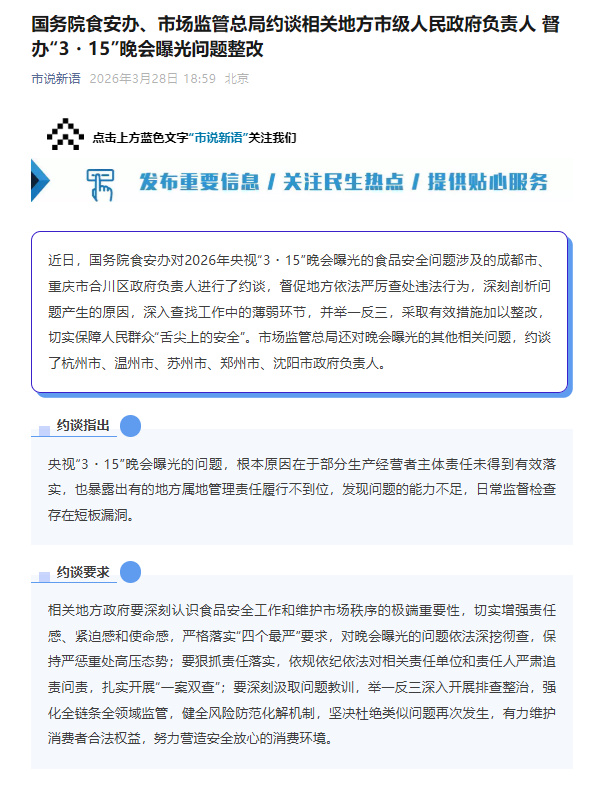 近日,国务院食安办对2026年央视“3・15”晚会曝光的食品安全问题涉及的成都市、重庆市合川区政府负责人进行了约谈,督促地方依法严厉查处违法行为,深刻剖析问题产生的原因,深入查找工作中的薄弱环节,并举一反三,采取有效措施加以整改,切实保障人民群众“舌尖上的安全”。市场监管总局还对晚会曝光的其他相关问题,约谈了杭州市、温州市、苏州市、郑州市、沈阳市政府负责人。