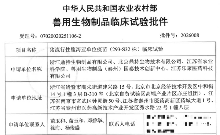 3月30日,记者从江苏省农业科学院获悉,由该院联合浙江鼎持生物制品有限公司、北京鼎持生物技术有限公司、兽用生物制品(泰州)国泰技术创新中心及江苏乐聚医药科技有限公司共同申报的猪流行性腹泻亚单位疫苗(293-S32株),近日成功获得中国农业农村部颁发的临床试验批件,批件号为2026008,这也是国内首个无针皮内免疫药械组合疫苗临床批件,标志着江苏省在兽用无针免疫关键技术领域取得里程碑式突破。