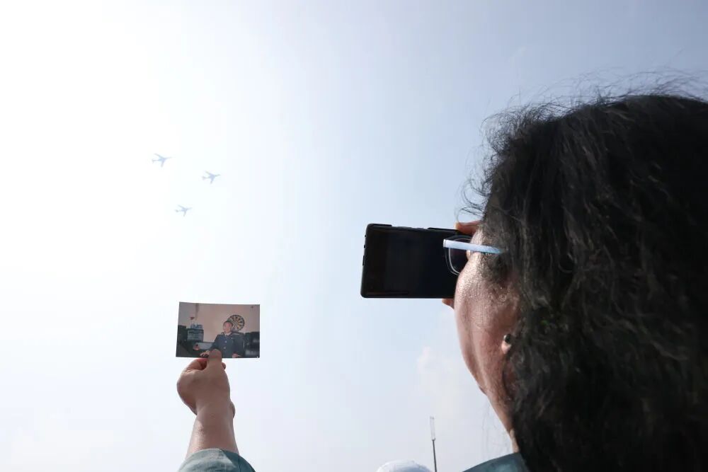 在观礼台上把王伟的照片举向蓝天