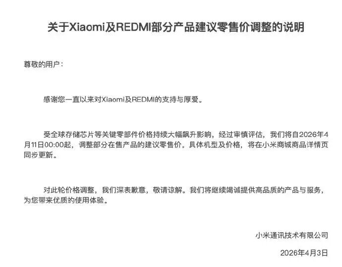小米4月3日发布公告,受全球存储芯片等关键零部件价格持续大幅飙升影响,经过审慎评估,公司将自2026年4月11日00:00起,调整部分在售产品的建议零售价。