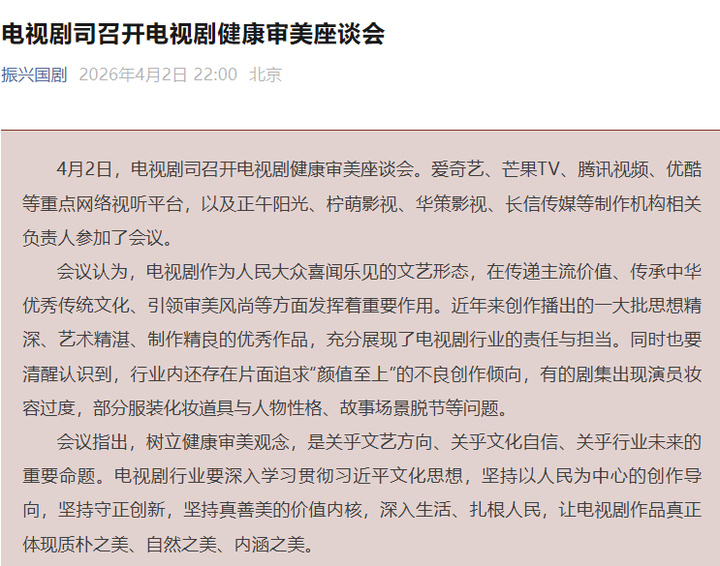4月2日,电视剧司召开电视剧健康审美座谈会。爱奇艺、芒果TV、腾讯视频、优酷等重点网络视听平台,以及正午阳光、柠萌影视、华策影视、长信传媒等制作机构相关负责人参加了会议。