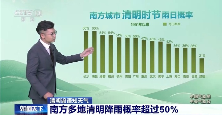 大城市当中,像是长沙、南昌、成都、福州,在清明时节遇雨的概率都超过了50%,大家在南方还是要带一把伞。