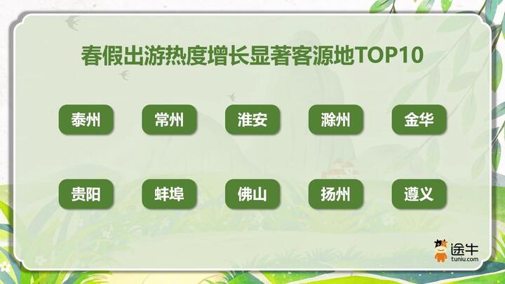 从客源地同比出游人次方面看,泰州、常州、淮安、滁州、金华、贵阳、蚌埠客源地表现亮眼,预订出游人次较去年同期增长均超3倍;佛山、扬州、遵义等客源地,预订出游人次较去年同期增长均超2倍。