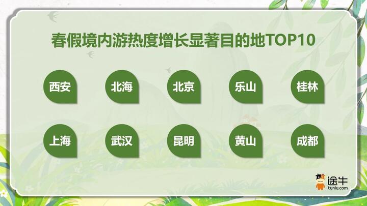 途牛旅游网数据显示,春假期间(4月1日至4月3日)多个目的地的客流迎来爆发式增长,春假对旅游市场带动效应显著。其中,西安、北海、北京、乐山等目的地途牛用户出游人次同比增长均超3倍;桂林、上海、武汉、昆明、黄山、成都等目的地途牛用户出游人次同比增长均超2倍。