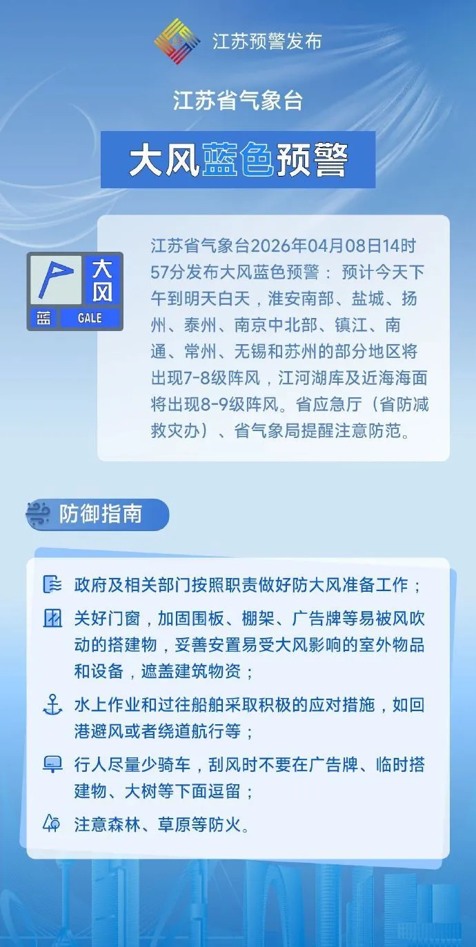 预计今天下午到明天白天,淮安南部、盐城、扬州、泰州、南京中北部、镇江、南通、常州、无锡和苏州的部分地区将出现7~8级阵风,江河湖库及近海海面将出现8~9级阵风。