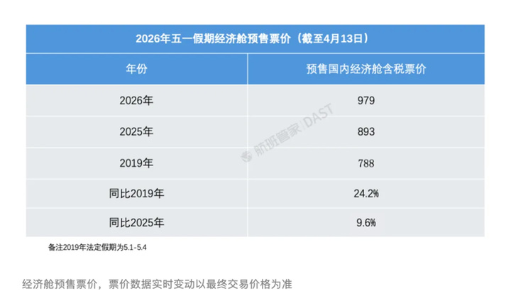 今年五一假期出行有望呈现“量价齐升”态势。机票价格方面,航旅纵横民航官方直销平台显示,4月30日多条热门航线机票将迎来价格峰值,其中包括北京至成都、北京至昆明、上海至重庆、上海至三亚等航线,部分航班经济舱票价已涨至全价,今年五一假期国内航线和出入境航班预订量均同比有所增长。航班管家数据显示,截至4月13日,五一假期国内经济舱预售票价为979元,同比增9.6%,较2019年增超两成。