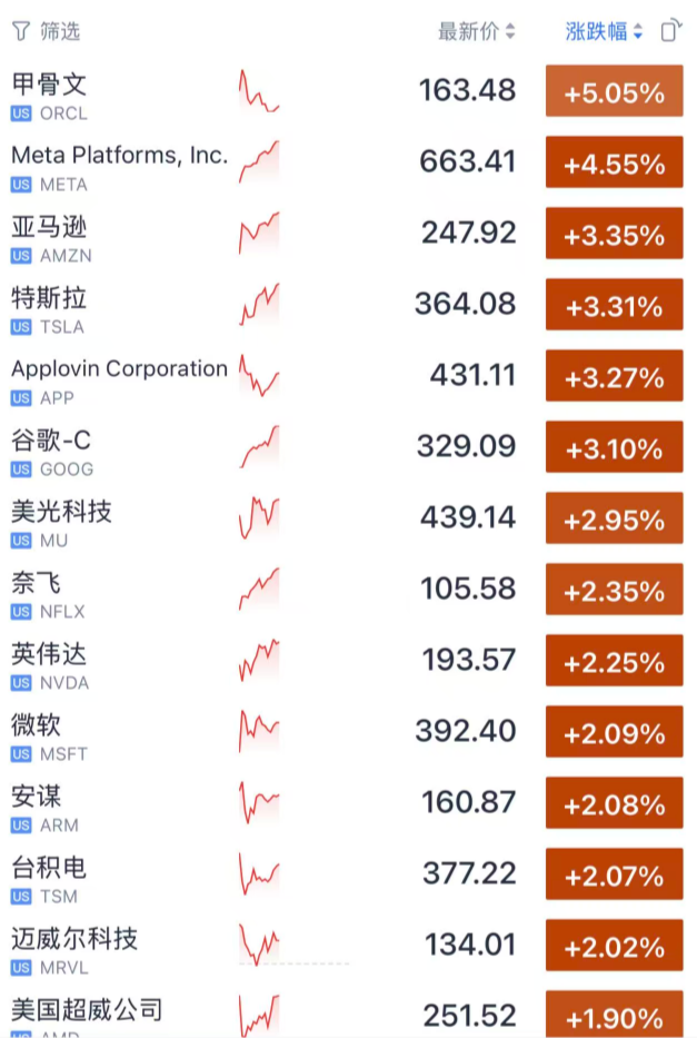 大型科技股集体飙涨,AI(人工智能)、半导体产业链持续走强。中国资产亦全线爆发,纳斯达克中国金龙指数大涨超2%。
