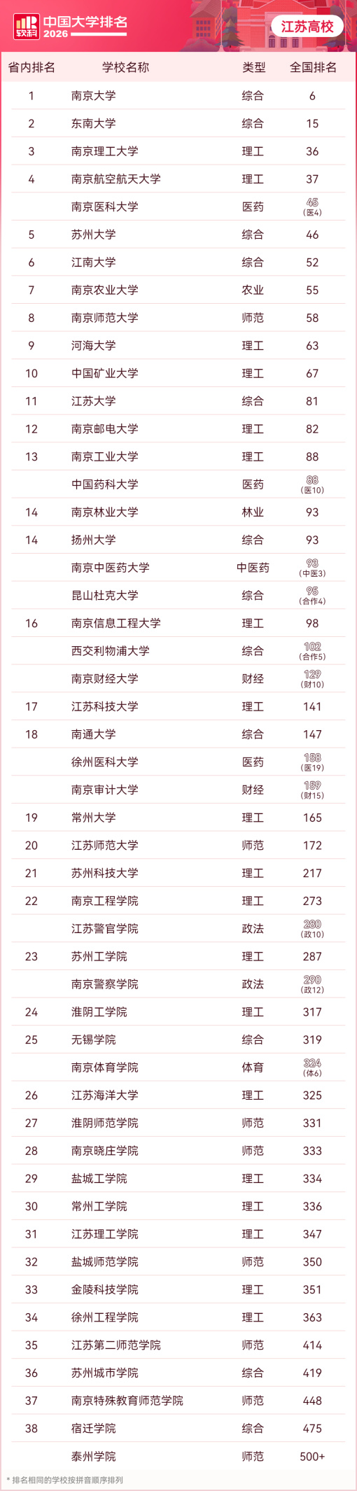 交汇点讯 4月15日,高等教育专业评价机构软科正式发布“2026软科中国大学排名”。江苏共有50所高校荣登全国总榜,上榜数量稳居全国第一。