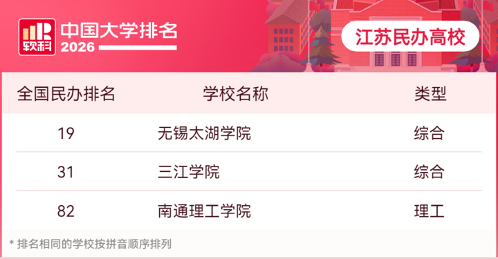 在民办高校主榜中,本省共有3所高校上榜,分别为无锡太湖学院(第19名)、三江学院(第31名)和南通理工学院(第82名)。