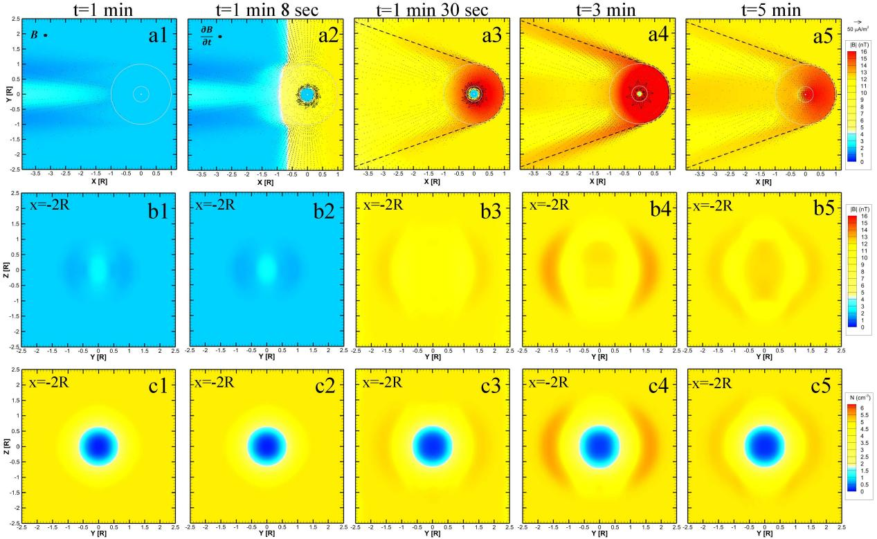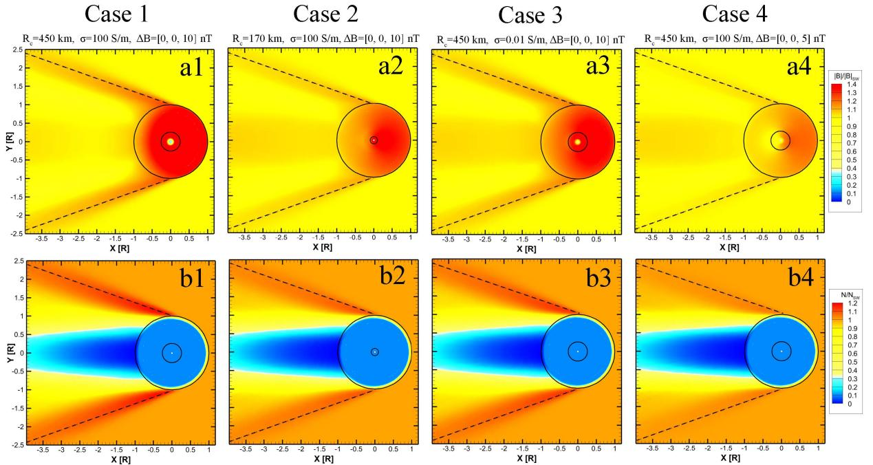 该研究进一步还原了临边压缩的完整演化过程:磁场突变传递至月球附近后,月核迅速产生感应电流,随着电流与感应磁场逐步增强,临边压缩现象愈发明显;后续磁场减弱,压缩结构也随之消退。同时团队还证实,月核半径越大、导电能力越强,引发的临边压缩效果就越显著。