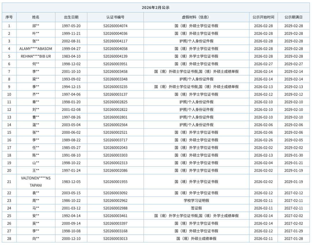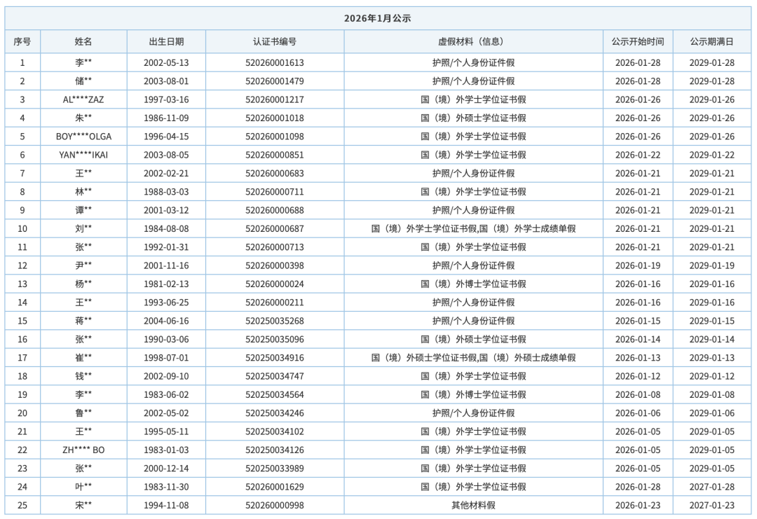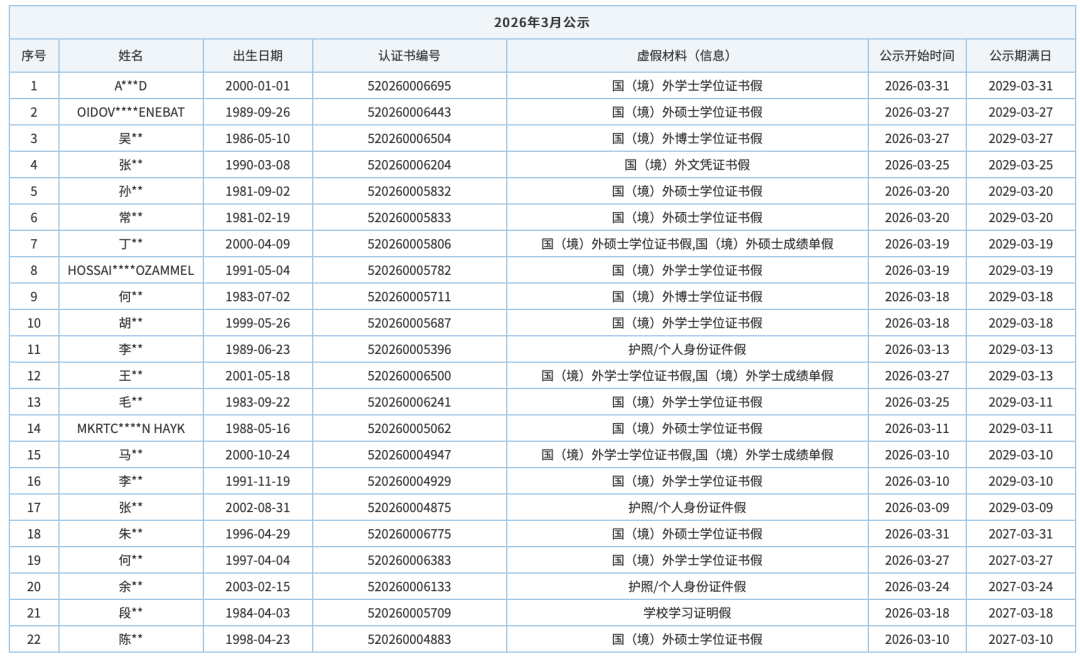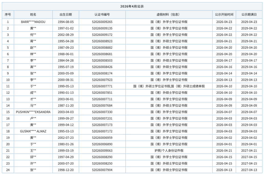 A近日,教育部留学服务中心发布《2026年国(境)外学历学位认证提供虚假材料(信息)行为公示》,披露2026年1至4月,共有99名认证申请人因提交虚假、伪造或无效资料,被官方查实并通报。