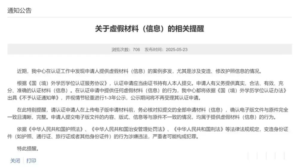针对学历认证造假,教育部留学服务中心早有明确规范,2025年5月曾通过官网发布《关于虚假材料(信息)的相关提醒》,明确惩戒标准:提供虚假材料或不实信息者,将被出具《不予认证通知单》,并根据情节轻重被公示1至3年,公示期内不再受理其任何认证申请。官方同时明确,电子版材料与原件在内容、版式、关键信息等方面不符,均属虚假材料,申请人需提前核对材料,确保清晰完整。
