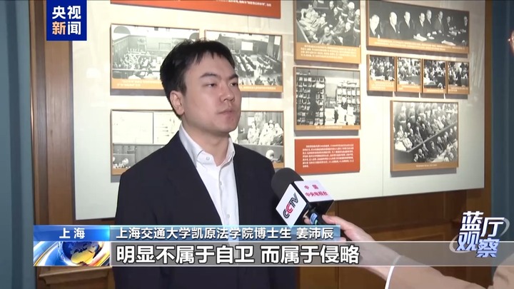 上海交通大学凯原法学院博士生姜沛辰告诉《蓝厅观察》记者,他的工作是梳理1931年日本侵略东北开始到东京审判时期,日本国际法学者、日本外交官对于国际法上自卫与侵略问题的认识,他们已经指出日本的行为在国际法上明显不属于自卫,而是属于侵略。但日本右翼政客至今仍不承认这一事实,所以我们应该把这些历史证据呈现出来,用这些事实来说话,让他们无法否认。