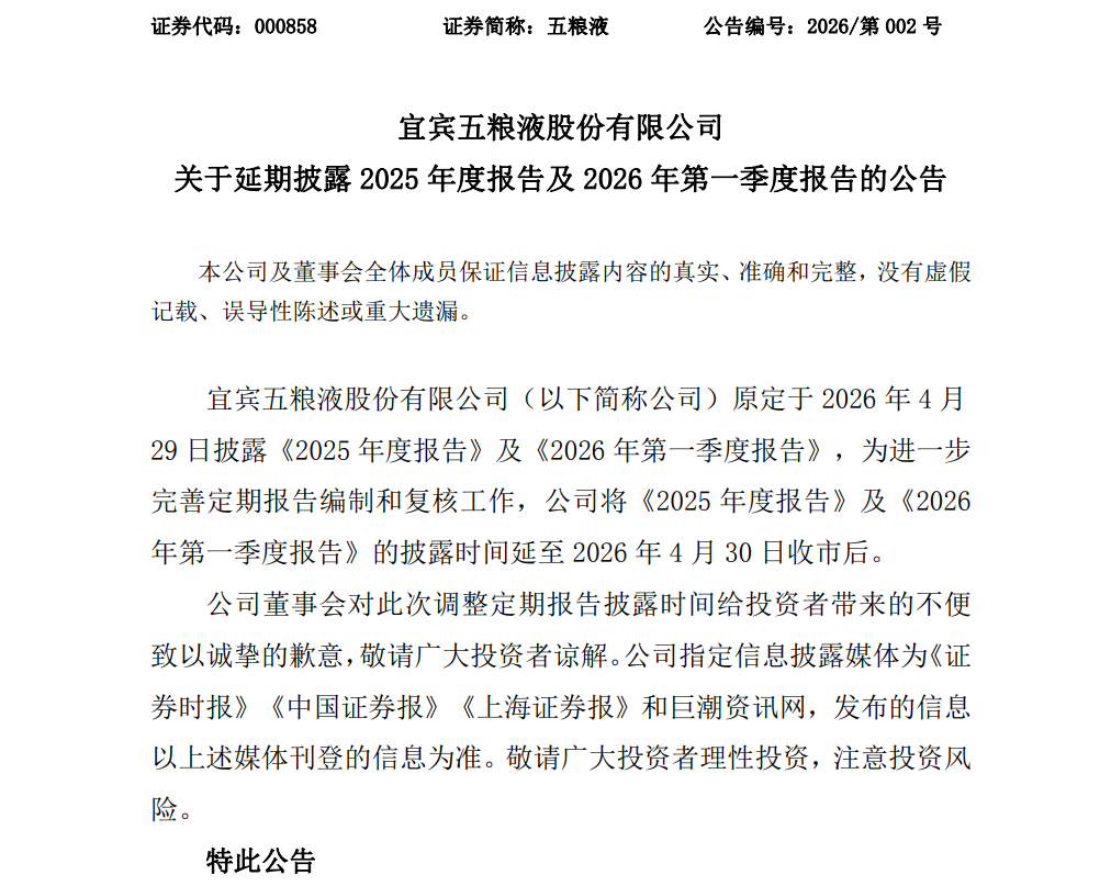 4月28日晚间,宜宾五粮液股份有限公司(五粮液,000858.SZ)公告,公司原定于2026年4月29日披露《2025年度报告》及《2026年第一季度报告》,为进一步完善定期报告编制和复核工作,公司将《2025年度报告》及《2026年第一季度报告》的披露时间延至2026年4月30日收市后。