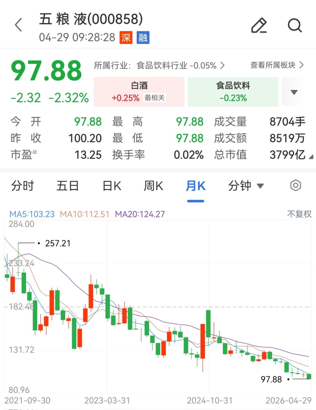 4月29日,五粮液早盘低开超2%,股价创出2020年4月以来新低。