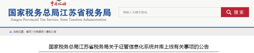 根据国家税务总局统一部署,江苏原国税、地税征管系统将于2019年4月1日起并库上线。为确保系统顺利切换和正常上线运行,江苏税收系统将于 2019年3月23日(星期六)00:00至3月31日(星期日)24:00期间进行系统切换上线。在此期间无法办理相关税收业务,故无法办理所有涉及税收的房产交易与不动产登记业务。其它不涉及税收的房产交易、不动产登记业务正常办理。