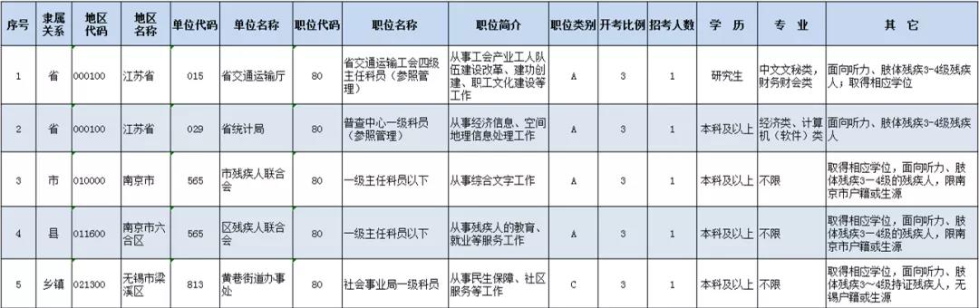 值得一提的是,江苏省交通运输厅、省统计局专设岗位,各定向招录1名残疾人。这是除省残联外,江苏省级机关首次公开明确招录残疾人,充分发挥省级党政机关在促进残疾人就业方面的示范带头作用。